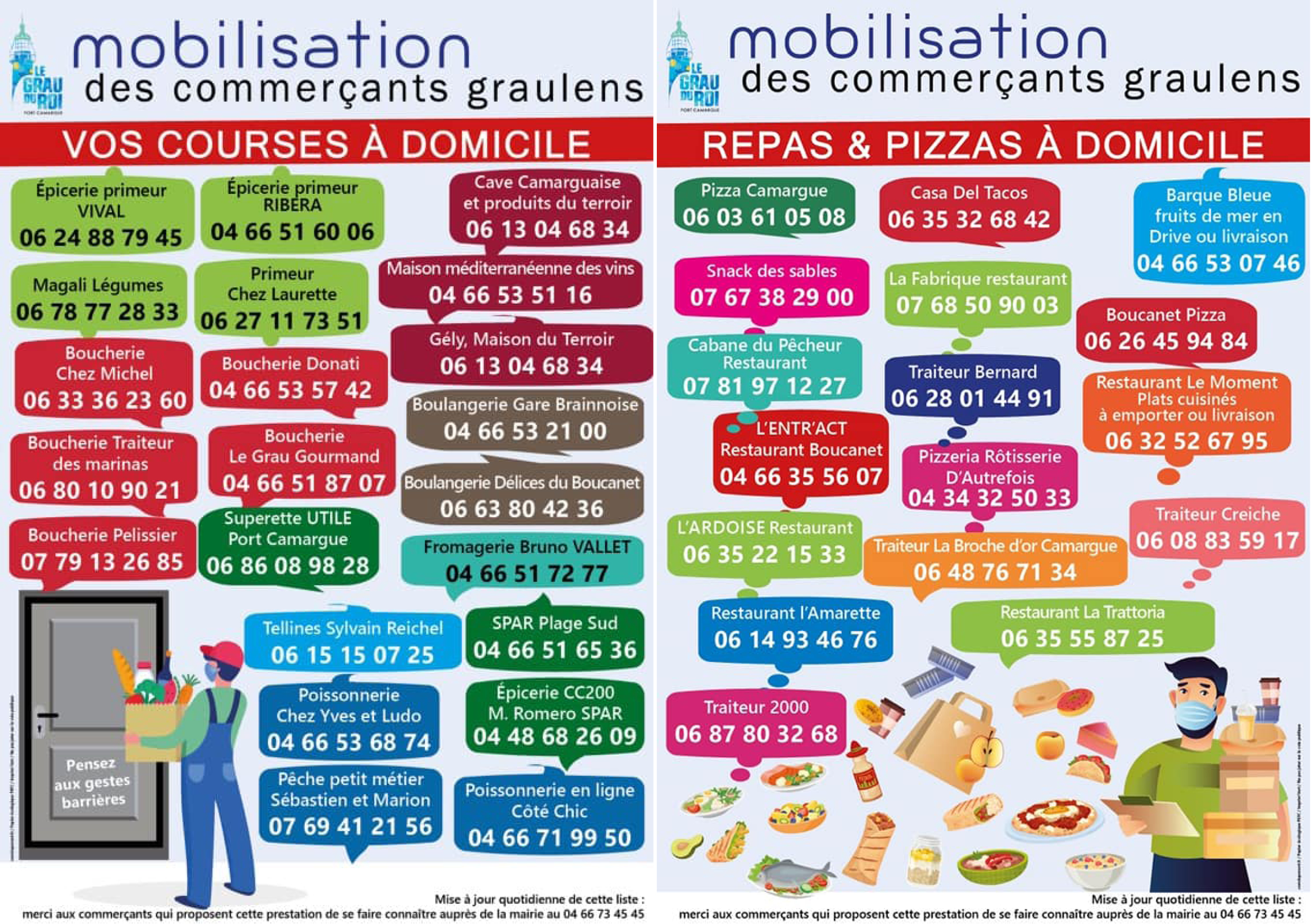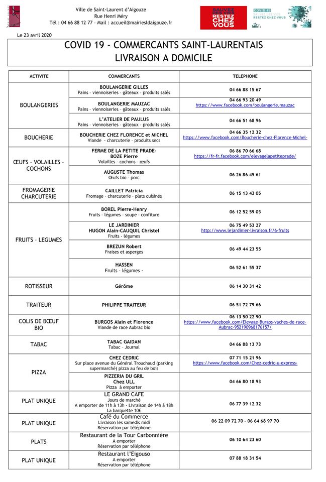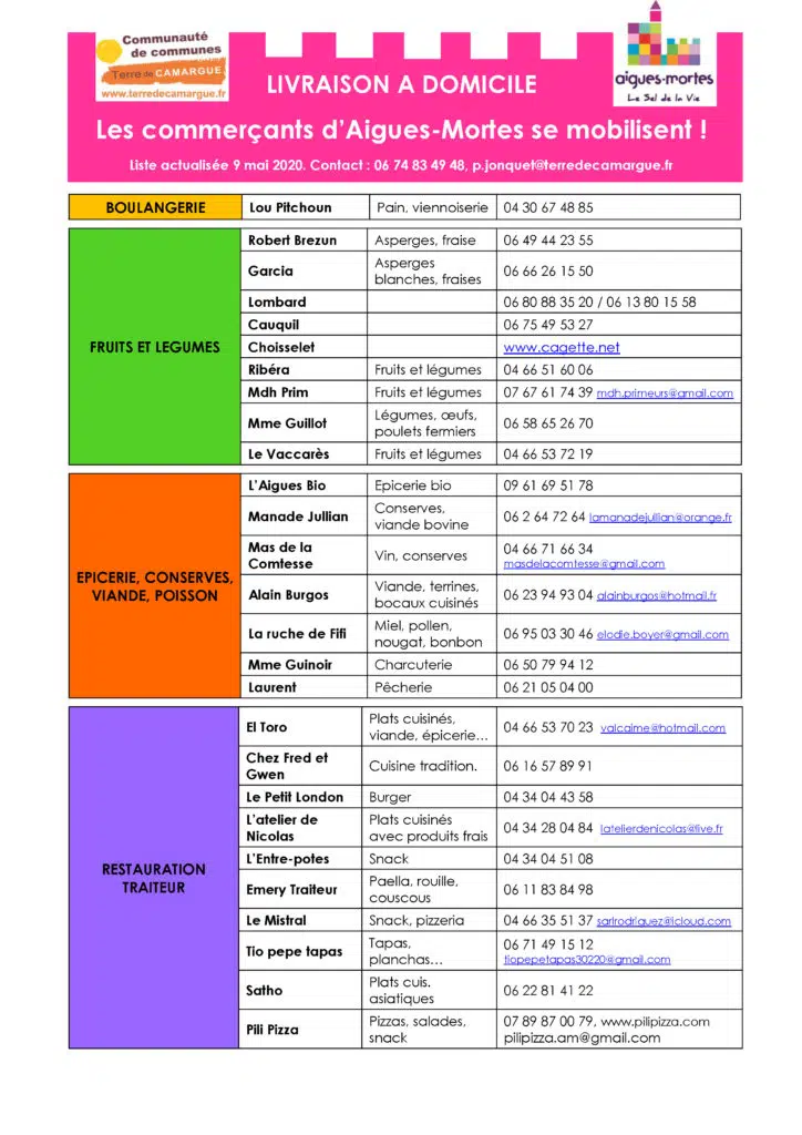 Voici les listes actualisées des commerçants qui se mobilisent pour livrer à domicile sur Aigues-Mortes, Le Grau du Roi et Saint-Laurent d’Aigouze : fruits et légumes, pain, oeufs, viande, poisson, épicerie, plats cuisinés…